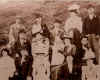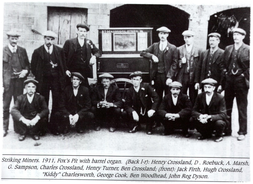 Striking Miners. 1911 Fox's pit with barrel organ. Names: CROSSLAND, ROEBUCK, MARSH, SAMPSON, TURNER, FIRTH, CHARLESWORTH, COOK, WOODHEAD, DYSON. Contributed by Connie Goldring (380 kb)