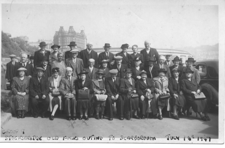 Group of Stocksbridge "Old Folks" on an outing to Scarborough. July 16th 1947.